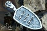 The reverse side bears the inscription "IHS SIGNO VINCES"—a Christian symbol of the victory of faith and spiritual support. The raised text harmoniously complements the grainy texture of the background and the frame, stylized as a reinforced shield with decorative rivets. The earring is adorned with a cross and is crafted in a consistent style throughout the piece.
