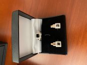 Женские серебряные серьги и кольцо из серебра 925 пробы с золотыми вставками 375 пробы и камнями - чёрными фианитами.